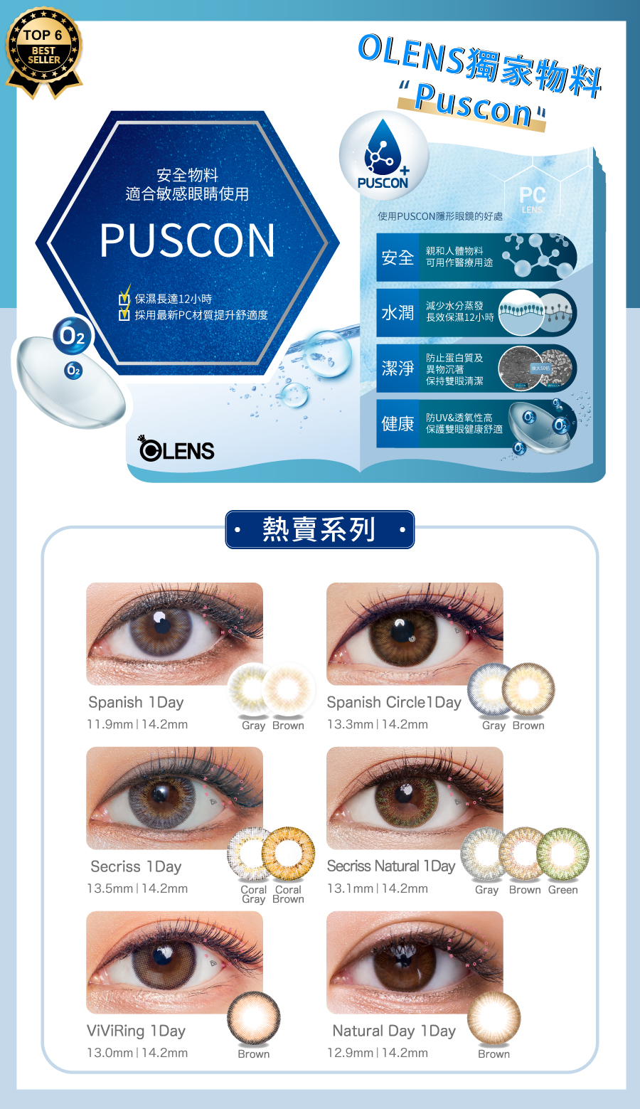 Biocompatible hydrophilic material PUSCON, it prevents protein adsorption and protect the lens surface cleanly in addition of providing moisture barriers which gives extra comfy and moistureto your eyes.